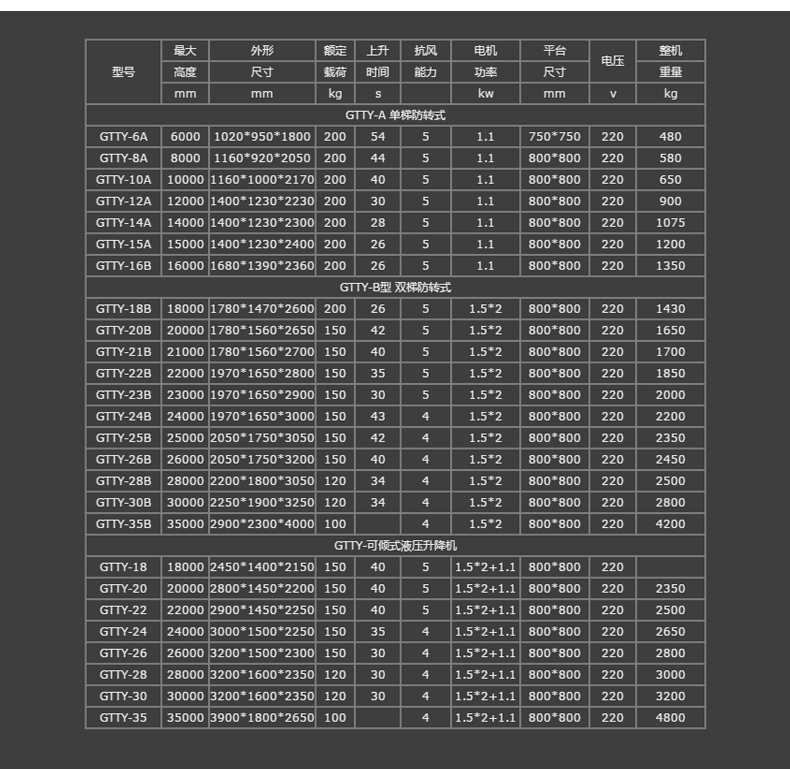 GTTY-B雙體防轉(zhuǎn)式套缸式升降平臺(tái)是一種多用途的單作用伸縮式套簡油缸組成的垂直升降機(jī)械。該升降平臺(tái)具有操作簡便、升降平穩(wěn)、結(jié)構(gòu)緊湊、雙體結(jié)構(gòu)更安全、晃動(dòng)小、重量輕、移動(dòng)方便由于升降平臺(tái)缸筒材料采用的是炮管使用的高強(qiáng)度無縫鋼管,再加上經(jīng)過好幾道加工工藝的精心修整,使得缸筒的光潔度和垂直度更加精確,從而保證了產(chǎn)品質(zhì)量的穩(wěn)定性和長久性。另外還設(shè)有油管爆裂、超載保護(hù)、應(yīng)急下降等裝置。是登高作業(yè)最安全,最經(jīng)濟(jì)實(shí)用的機(jī)具。